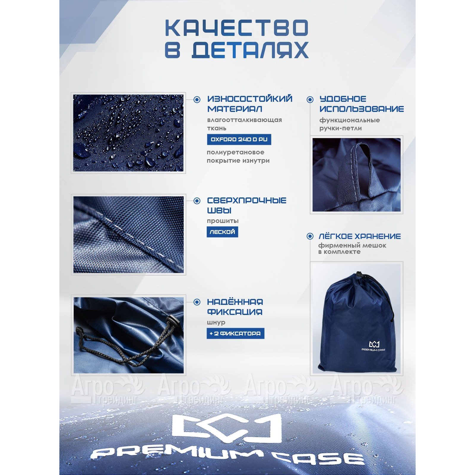 Два надежных фиксатора (спереди и сзади) и сверхпрочный шнурок внизу чехла обеспечивают его плотное прилегание к технике и гарантируют безупречную защиту от непогоды и каких-либо повреждений. Для удобства использования чехол-накидка оснащена практичными петельчатыми ручками, что дает возможность быстро как одевать, так снимать его с техники.