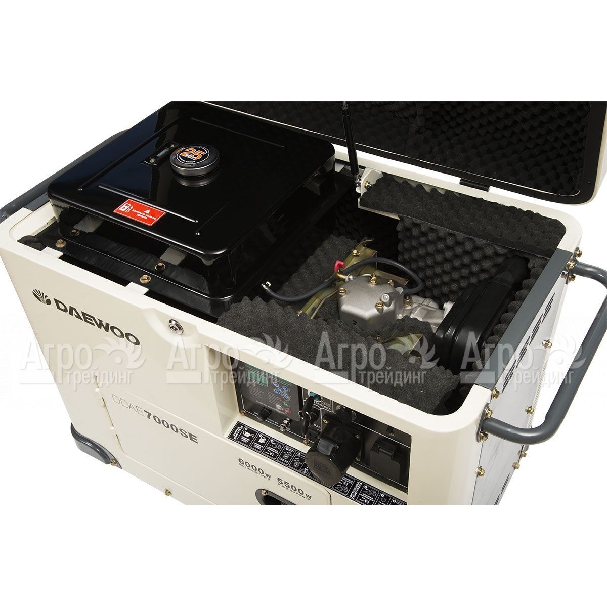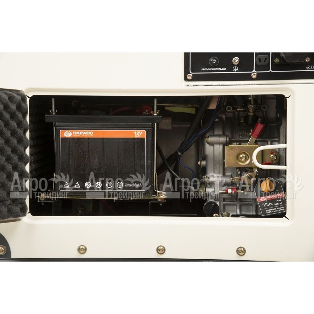 Характеристики товара: Дизельгенератор Daewoo DDAE 7000 SE 5.5 кВтПодробное описание товараДизельгенератор Daewoo DDAE 7000 SE предназначен для питания однофазных потребителей общей мощностью не выше 6 кВт. Выполнен в шумоизолирующем кожухе Super Silent, который обеспечивает гашение шумов и вибрации, а также защиту внутренних узлов от внешних воздействий. Топливо закачивается в двигатель в автоматическом режиме с помощью топливного насоса высокого давления и специальной форсунки, что делает работу двигателя стабильной и на 15% экономит топливо. Профессиональный двигатель обладает ресурсом более 2000 часов, стартер и аккумулятор позволяют осуществлять запуск от ключа. Встроенное устройство автоматического контроля напряжения обеспечивает качество тока на выходе. Опционально доступна установка блока автоматики ATS для автоматического запуска. Система защиты от перегрузок и датчик контроля уровня масла повышают надежность и эксплуатационную службу дизельгенератора. Альтернатор с медными обмотками обеспечивает стабильную выработку тока, мощность и отличную теплоотдачу. На компьютере с многофункциональной сенсорной панелью управления, в режиме реального времени можно наблюдать все основные параметры работы дизельгенератора Daewoo DDAE 7000 SE -напряжение, силу тока, частоту тока, нагрузку, запас топлива, температуру двигателя, запас топлива, количество отработанных моточасов. Штатное зарядное устройство размещенное на панели управления дает возможность заряжать автомобильный аккумулятор.